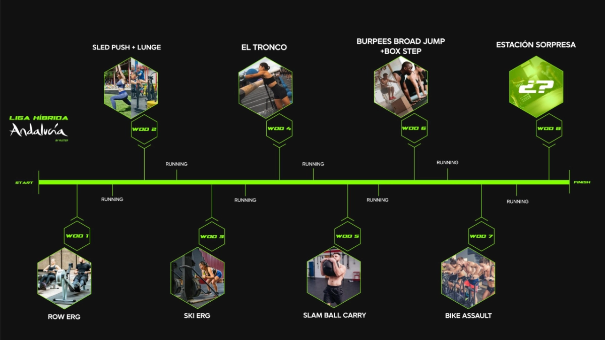 La Liga Híbrida Andalucía 2026 es un circuito de carreras híbridas que combina tramos de carrera a pie con estaciones de ejercicios funcionales (remo, trineo, burpees, bici de aire, etc.). Incluye cuatro eventos en Sevilla, Málaga, Córdoba y Jaén, con categorías individual, dobles y equipos, y reparte 20.000 € en premios entre las distintas divisiones.